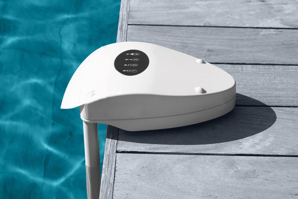 Quatre bornes forment un faisceau invisible autour du bassin ; le passage d’un enfant ou d’un animal coupe le rayon et lance l’alarme.